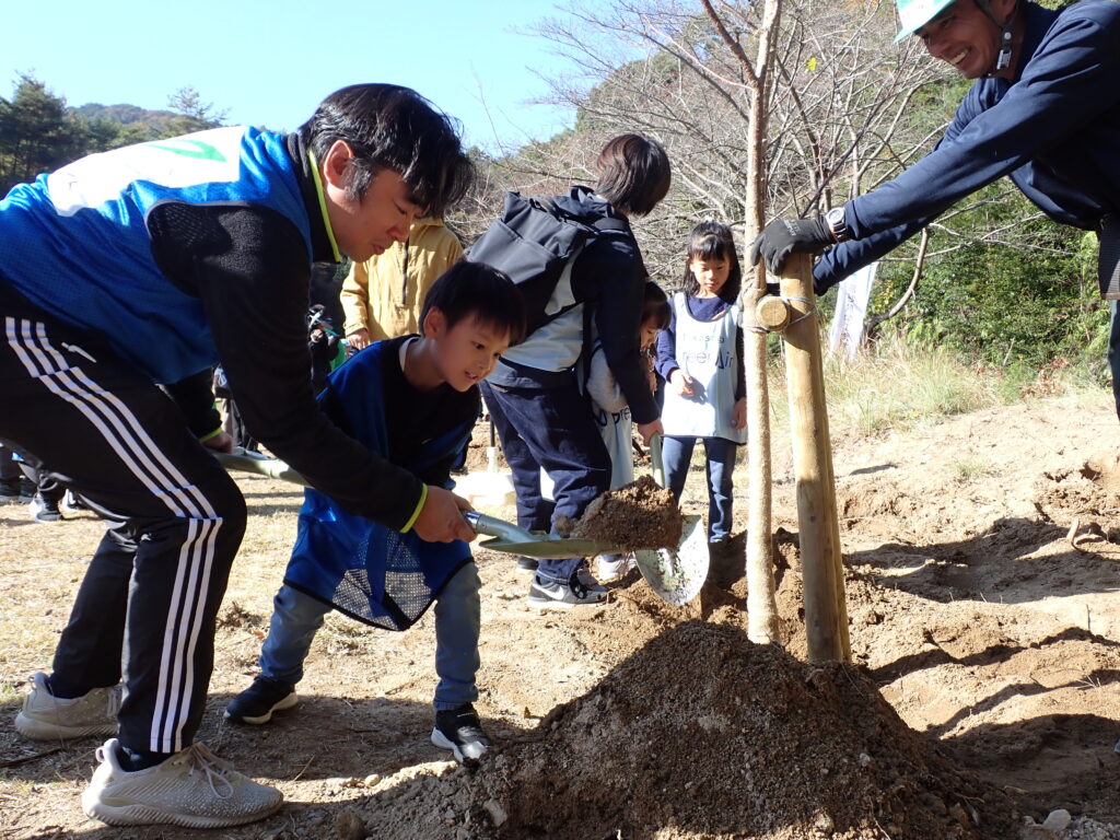 シャベルで土をかけて植樹します