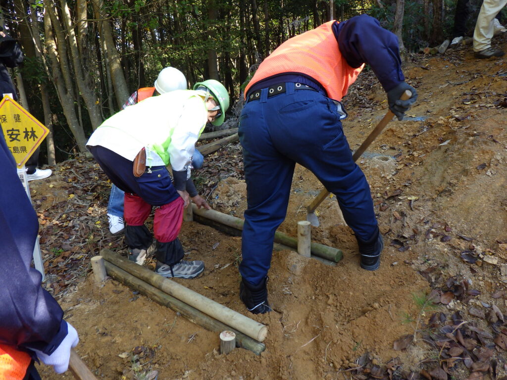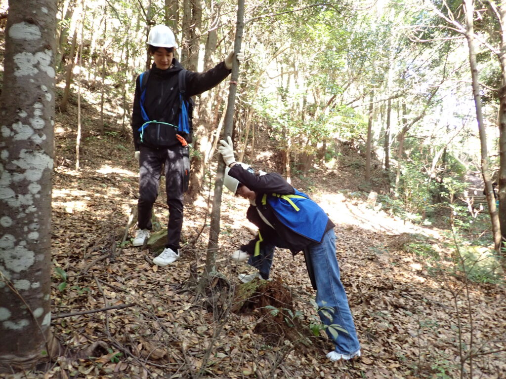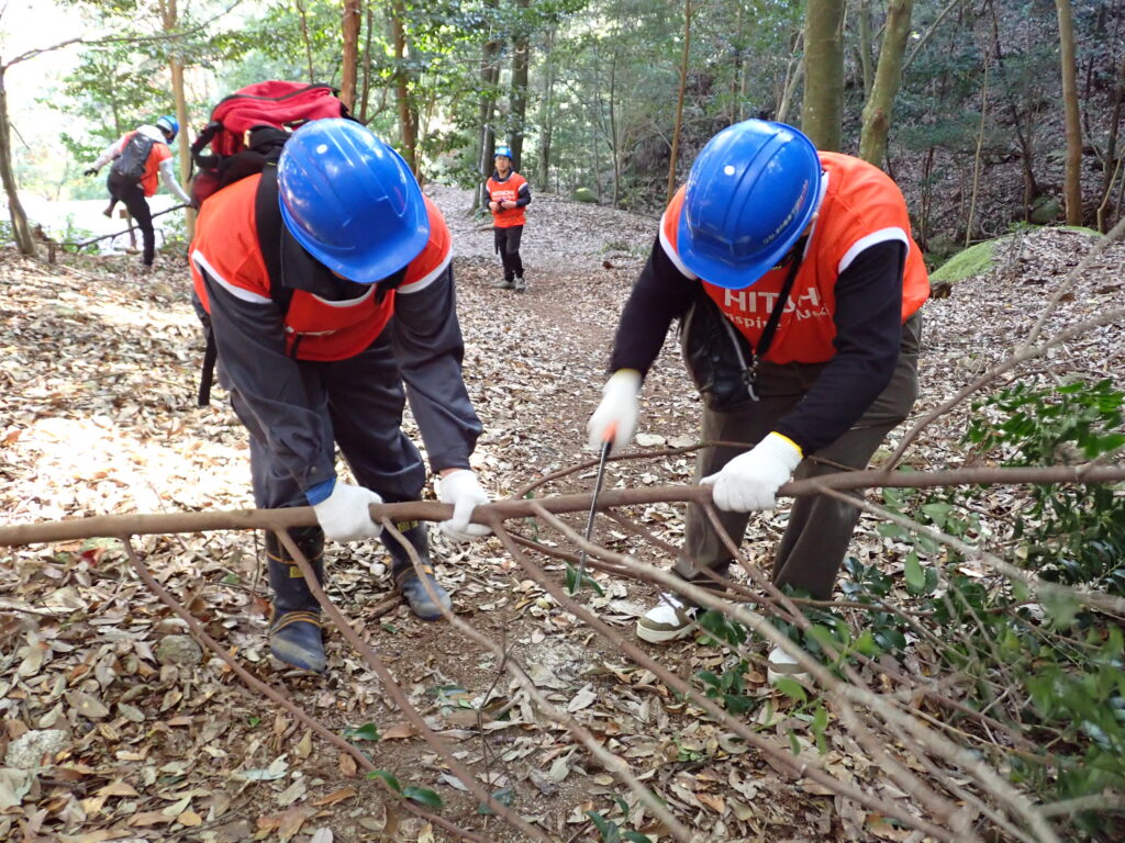 その後は班ごとに分かれて、指導員(広島市里山整備士会、ふれあい湧(わーく))の皆様のもと、除伐や階段整備等を行っていただきました。