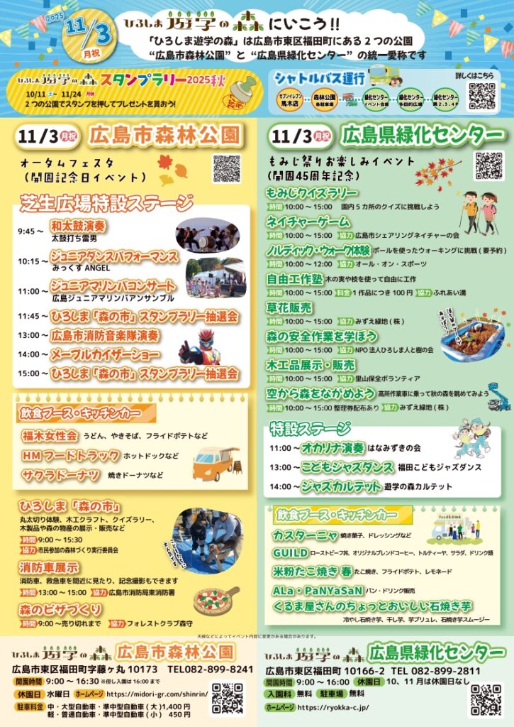 なお、隣接する広島市森林公園では、オータムフェスタ(開園記念日)のイベントも開催されており、シャトルバスを利用すれば、両方のイベントに参加できますよ!