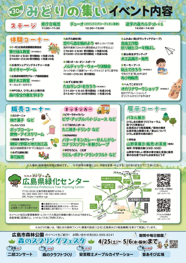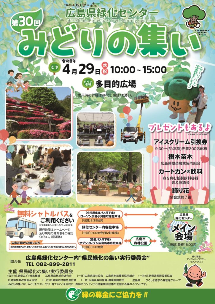 お知らせ 2026年04月1日 🌸春はみんなで緑化センターへ🌸4/29(土)に第30回みどりの集いが開催されます! 令和8年4月29日(火・祝)に広島県緑化センターで、「第30回みどりの集い」が開催されます。 毎年大人気の折り紙ヒコーキ飛ばしや木工教室など、楽しいイベントが盛りだくさん!キッチンカーもやってきます! 入園料・駐車場は無料です。先着プレゼントもあります☺ 広島県緑化センターは広島市内中心部から車で約30分。当日は無料シャトルバスも運行します。 GW始まりはみんなで緑化センターへ!皆さまの来場をお待ちしています🌷 前の記事へ 一覧に戻る